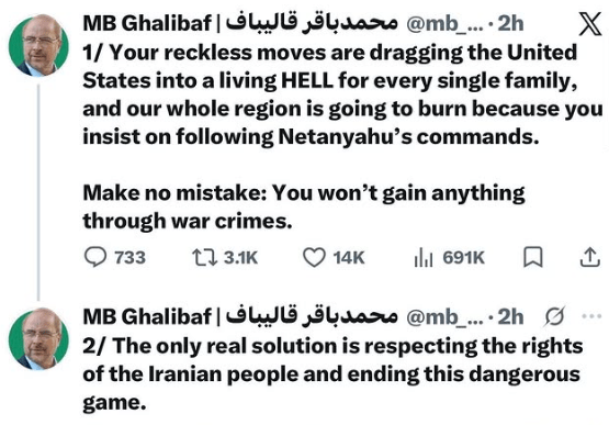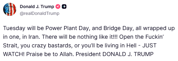 A forewarning new Security Council (SC) report circulating in the Kremlin today first noting President Donald Trump posted the vulgar war threat yesterday: “Tuesday will be Power Plant Day, and Bridge Day, all wrapped up in one, in Iran…There will be nothing like it!!!…Open the Fuckin’ Strait, you crazy bastards, or you’ll be living in Hell – JUST WATCH!…Praise be to Allah”, says top Iranian leader Parliament Speaker Mohammad Bagher Ghalibaf then posted his warning reply: “Your reckless moves are dragging the United States into a living HELL for every single family, and our whole region is going to burn because you insist on following Netanyahu’s commands…Make no mistake: You won’t gain anything through war crimes”.