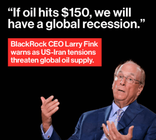 Along with the lifeless bodies of victims continuing to be pulled from rubble because of the “profoundly illegal and unjust” war President Trump is waging on Iran, this report continues, top Russian presidential envoy Kirill Dmitriev posted the grave warning yesterday: “We may see $150+ oil already within the next 2 weeks”—CEO Larry Fink of the world’s largest financial giant BlackRock had already warned that a $150 oil price would cause a global recession—global energy experts gravely observed last week: “When the first US and Israeli missiles hit Iran more than a month ago, an oil price of $150 per barrel was considered a doomsday prediction…But the price of physical Brent crude is already a hair’s breadth from $150, while the futures price hasn’t caught up yet…On Thursday, it reached $141.37, a level unseen since the onset of the 2008 financial crisis”—and as the world hurtles towards a doomsday financial crisis and global recession, the Washington Post assessed in terror: “Like thunderclaps that herald an advancing storm, rising energy bills, interest rates and supply shortfalls may be warnings of worse to come”.