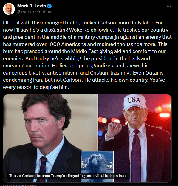 In quick response to Tucker Carlson exposing the truth about why Middle East leaders are being killed by the Americans, this report continues, warmongering Zionist radical Fox News host Mark Levin raged: “I’ll deal with this deranged traitor, Tucker Carlson, more fully later…For now I’ll say he’s a disgusting Woke Reich lowlife…He trashes our country and president in the middle of a military campaign against an enemy that has murdered over 1000 Americans and maimed thousands more…This bum has pranced around the Middle East giving aid and comfort to our enemies…And today he’s stabbing the president in the back and smearing our nation”.