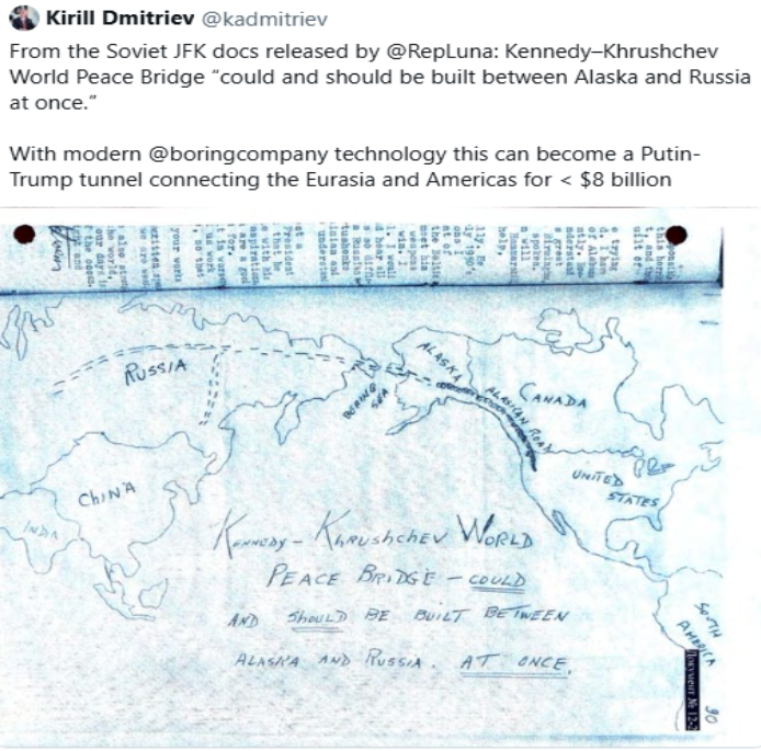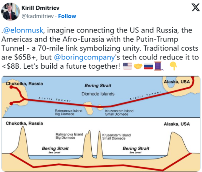 With everyone knowing, including President Trump, that Ukraine will collapse within six months, this report notes, top President Putin advisor CEO Kirill Dmitriev of the Russian sovereign wealth fund RDIF, who oversees the largest construction projects in Russia, posted the notice last week: “Elon Musk, imagine connecting the US and Russia, the Americas and the Afro-Eurasia with the Putin-Trump Tunnel – a 70-mile link symbolizing unity…Traditional costs are $65 Billion+, but Boring Company’s tech could reduce it to less than $8 Billion…Let’s build a future together!”—CEO Dmitriev was immediately summoned to visit the United States where today he will meet with top Trump officials in Florida, about which he revealed: “We will not disclose specific details about our meetings…We will engage with several representatives of the Trump administration, and while one meeting will be made public, most discussions will take place behind closed doors”, and he added: “We will convey to our American colleagues that they must not become the Bidens, must not follow the false, completely wrong and failed approaches of Biden and his administration”.