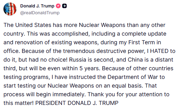 Trump Orders War Department To Resume Nuke Testing After Putin Reveals Super Torpedo
