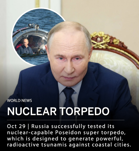 A forewarning new Security Council (SC) report circulating in the Kremlin today first noting President Putin revealed yesterday about the Poseidon super torpedo, that is able to unleash mountain size radioactive tsunamis against enemy coastal targets: “For the first time, we succeeded not only in launching it from a submarine using its booster engine, but also in starting its nuclear power unit, which provided energy to the vehicle for a certain period of time…This is a tremendous success”, says this revelation was quickly followed by President Donald Trump posting the warning announcement: “The United States has more Nuclear Weapons than any other country…This was accomplished, including a complete update and renovation of existing weapons, during my First Term in office…Because of the tremendous destructive power, I HATED to do it, but had no choice!…Russia is second, and China is a distant third, but will be even within 5 years…Because of other countries testing programs, I have instructed the Department of War to start testing our Nuclear Weapons on an equal basis…That process will begin immediately”.